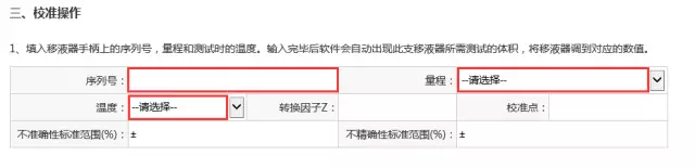 5.以下界面填入移液器手柄上的序列號,選擇量程和測試時(shí)的溫度。輸入完畢后軟件會(huì )自動(dòng)出現此支移液器所需測試的體積,將移液器調到對應的體積數值。