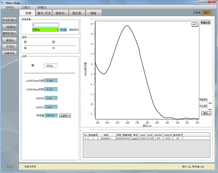 3、輸入樣品編號,選擇檢測的樣品類(lèi)型(默認的設定為DNA,消光因子為50)。用移液器滴加樣品0.5-2μl到Micro Drop下部樣品基座,關(guān)閉上臂,選擇“檢測”,軟件會(huì )自動(dòng)計算出的核酸濃度和純度比例,3-5秒內,即可顯示實(shí)驗結果及光譜圖。