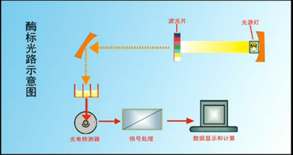 不同的光源發(fā)射出特定的發(fā)射光透過(guò)載物的微孔板、光的一部分被物質(zhì)吸收,從而前后光的強度發(fā)生變化,這種特異性的強度變化與被測物濃度呈一定比例關(guān)系,能夠定量、定性地檢測結果。該儀器操作簡(jiǎn)單,技術(shù)成熟,但靈敏度不高,當需要測定不同波段時(shí),需切換不同光源。